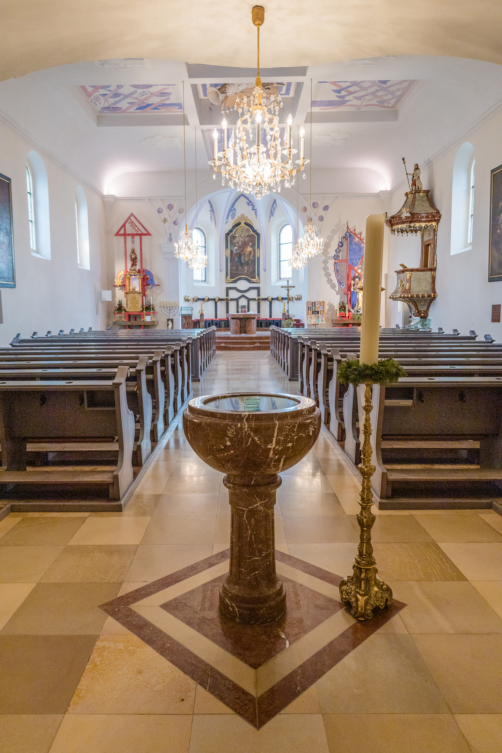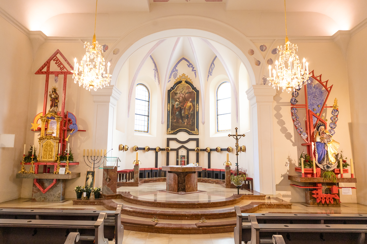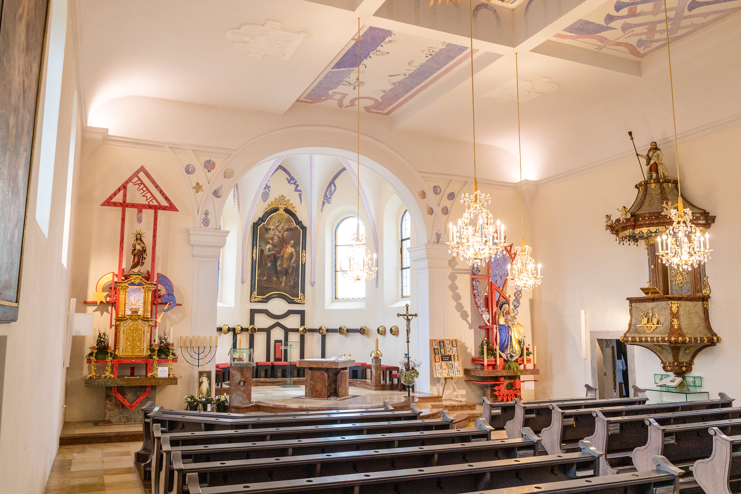 Besondere Bedeutung kommt der modernen Neugestaltung des Kircheninnenraums durch den Künstler Helmut Lutz zu. Sein künstlerisches Konzept verbindet zeitgenössische Formen mit christlicher Symbolik, vor allem mit Motiven aus der Offenbarung des Johannes. Themen wie das Himmlische Jerusalem, das Lamm Gottes, der Kampf zwischen Gut und Böse sowie Anfang und Ende der Schöpfung prägen die Gestaltung von Langhausdecke, Chorraum, Altar, Tabernakel und Marienstelen. Historische Elemente wurden bewusst integriert und in ein neues Gesamtkonzept eingebunden.