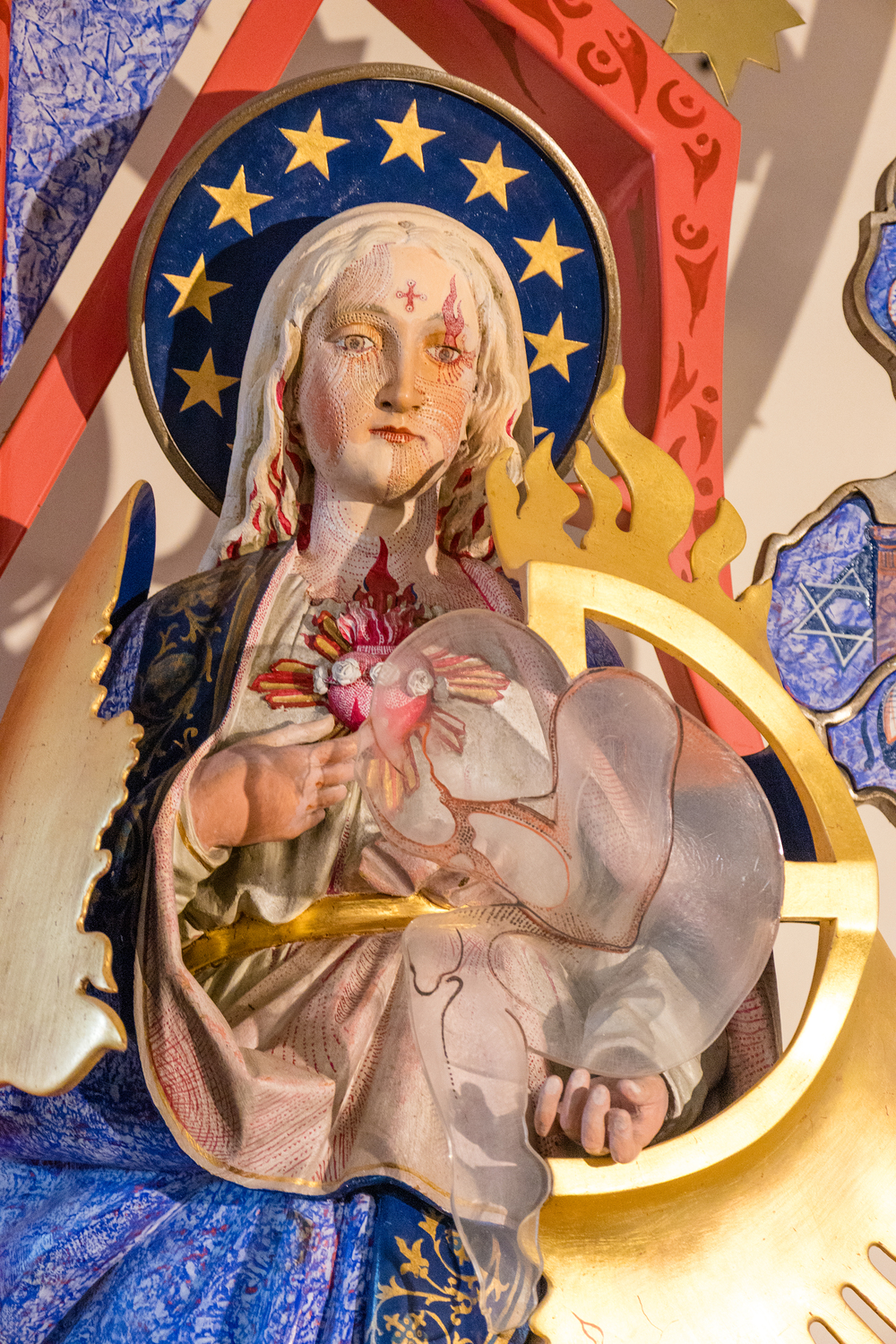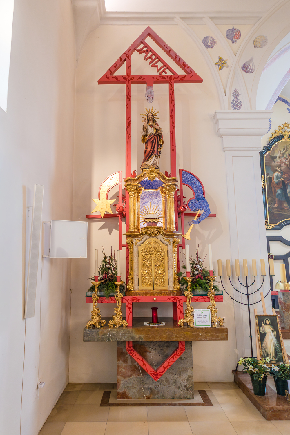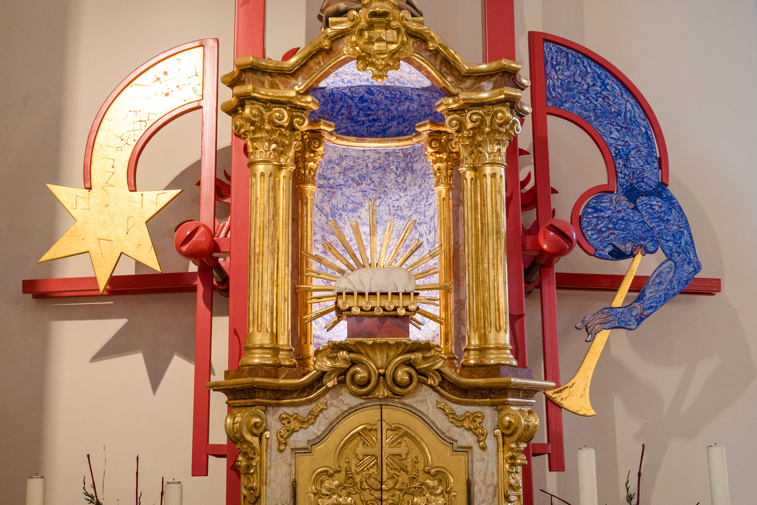 Besondere Bedeutung kommt der modernen Neugestaltung des Kircheninnenraums durch den Künstler Helmut Lutz zu. Sein künstlerisches Konzept verbindet zeitgenössische Formen mit christlicher Symbolik, vor allem mit Motiven aus der Offenbarung des Johannes. Themen wie das Himmlische Jerusalem, das Lamm Gottes, der Kampf zwischen Gut und Böse sowie Anfang und Ende der Schöpfung prägen die Gestaltung von Langhausdecke, Chorraum, Altar, Tabernakel und Marienstelen. Historische Elemente wurden bewusst integriert und in ein neues Gesamtkonzept eingebunden.