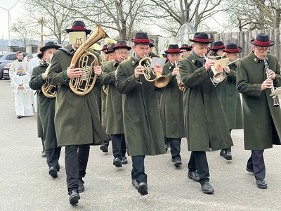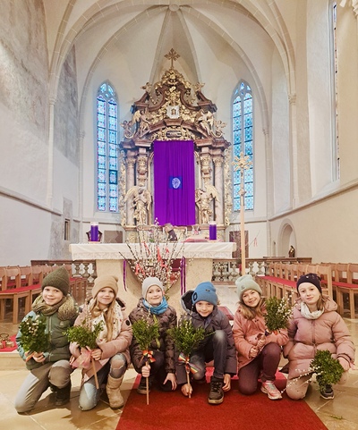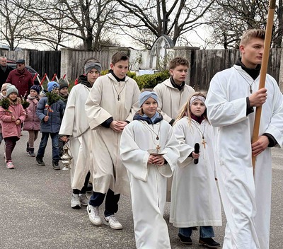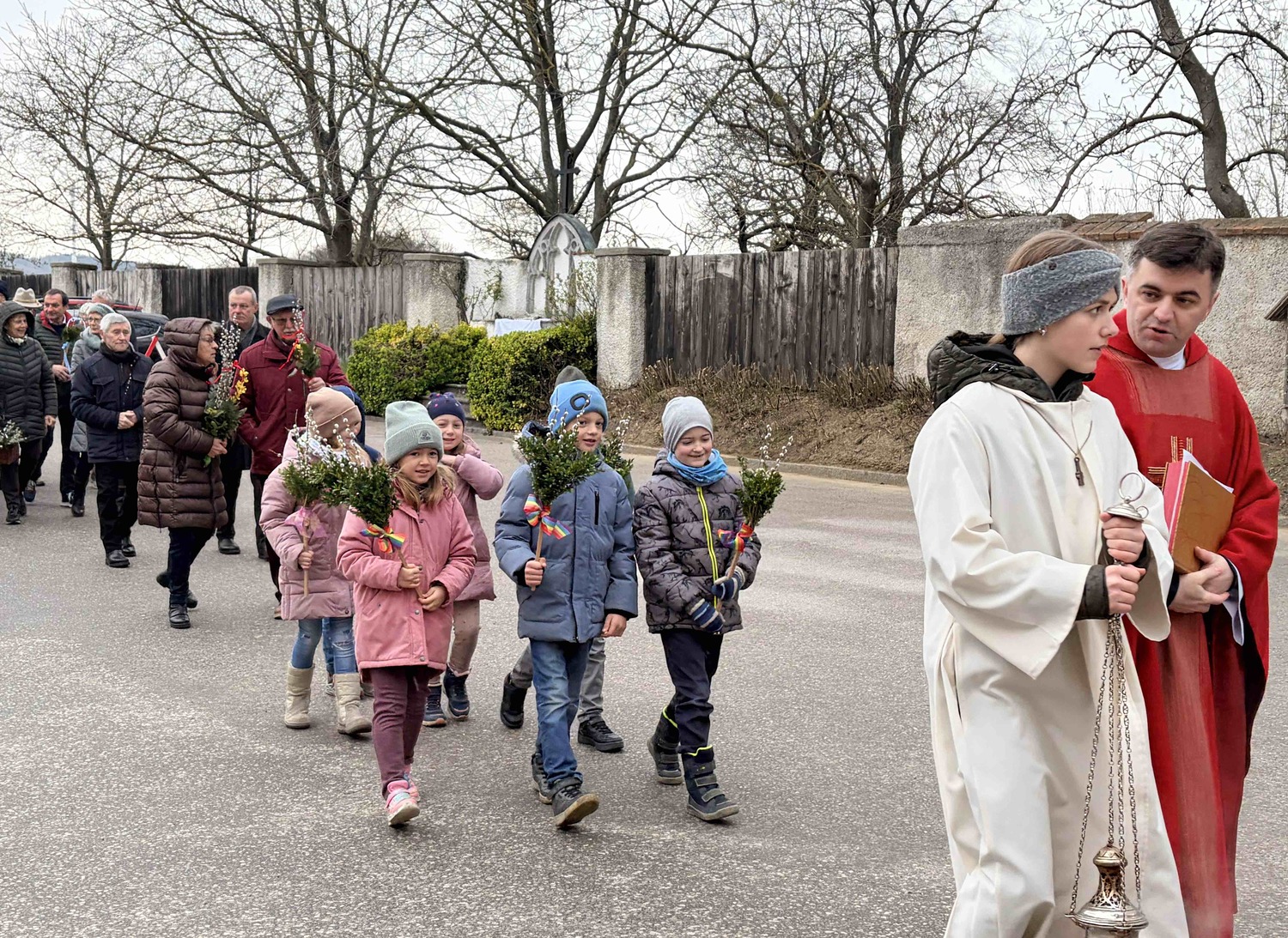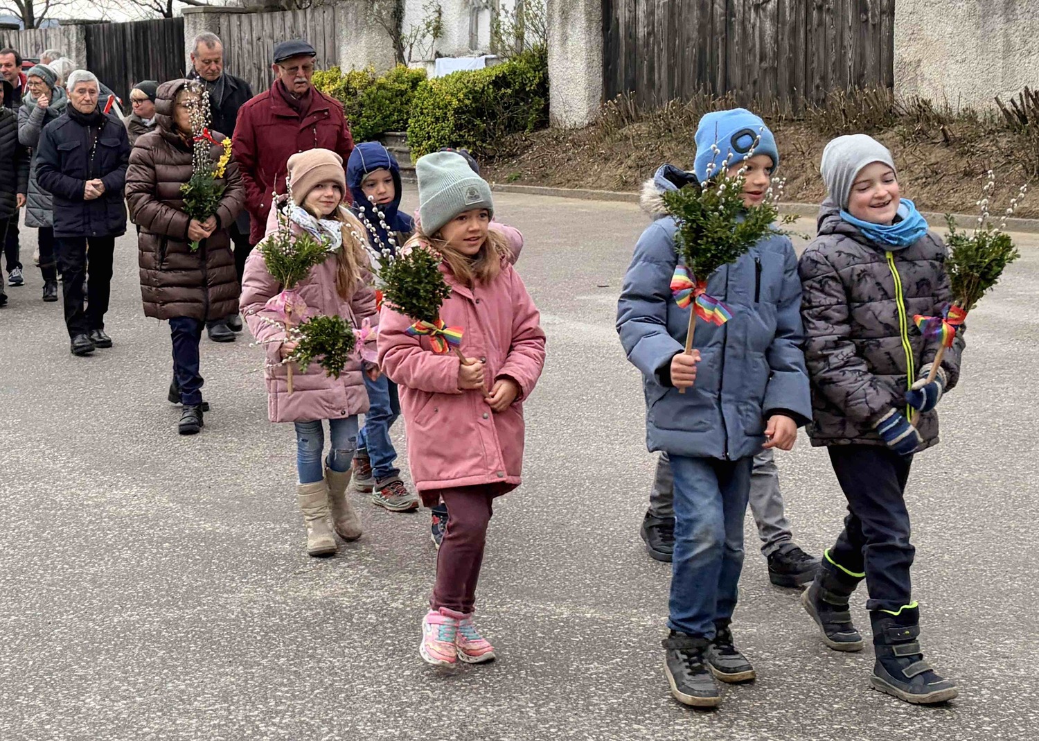 Der feierliche Einzug mit den geweihten Palmbuschen vom Kirchenplatz in die Pfarrkirche wurde stimmungsvoll vom Musikverein Kapelln begleitet. Besonders schön war die große Beteiligung der Erstkommunions- und Firmkinder.